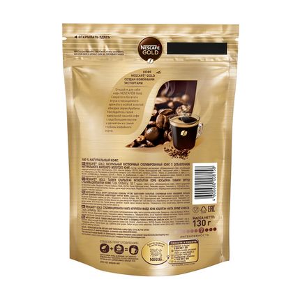 Арт. 1704115Кофе растворимый, Nescafe Gold, подарит Вам насыщенный вкус и аромат любимого горячего напитка. Компактную упаковку можно взять с собой в дорогу или на работу. Масса нетто: 130 г.